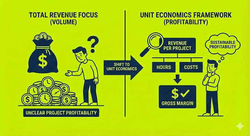 By applying a unit economics lens, these issues became visible. Rather than relying on instinct, the founders could see in black and white which projects were eroding gross margin. In many cases, the solution was not to walk away immediately, but to identify opportunities for upselling or restructuring the scope of work so that pricing better reflected the value delivered.