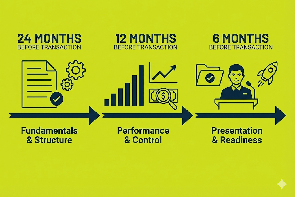 Exit readiness is not a single project, it is a sequence of disciplines that build on one another over time. The companies that achieve the smoothest transactions begin preparing long before they appoint advisors or engage with buyers. The first stage typically begins around twenty four months before a planned exit. At this point, the focus should be on strengthening the fundamentals: formalising accounting policies, defining KPIs, building clean datasets and establishing reliable reporting cycles. This is also the period to address structural issues such as cap table clarity, contract organisation and intellectual property assignments. Early preparation creates the foundation that later valuation will depend on.